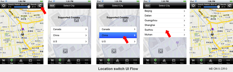 它的优势在于可以在一屏中解决所有的问题。但为了更好的使用Pickers,你需要加入更多的诸如Supported City等提示信息以区分两个Pickers,以及顶部的Done Cancel按钮,以完善flow。