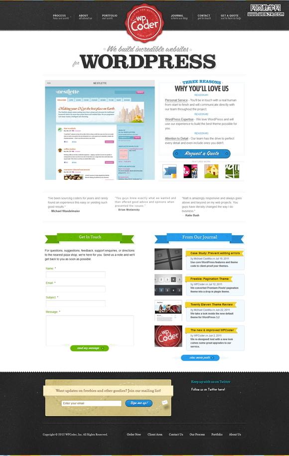 下图是一个提供WordPress网站建设的公司,在它的主页上从上到下可以看到这样几部分信息:导航、Logo、口号、作品展示、选择我们的理由、联系表单、日志列表、邮件订阅、Twitter信息以及版权信息。其中的第一视觉无疑是公司的口号和作品展示,这就是此网站主页上的核心内容。因为作为一个网站建设公司来讲,直观的让客户知道你是干什么的?干的怎么样?应该是客户最想要了解的内容。那么对于核心内容,在视觉上做了哪些考虑呢?