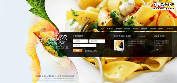 如果上面的页面布局仍然让人觉得中规中矩的话,下面的一个酒店的主页的布局也许会让我们感觉有些新意。可以看到,此设计的背景用了大幅的食物图片,导航和主内容区只占到整个页面高度的三分之一,让背景的图片大面积的呈现出来,和上面的设计一样,这样布局的目的并非单纯是为了标新立异或者是为了视觉上的美观,而是该酒店的特色也许就在于餐饮方面,所以为了对核心内容进行突出,在布局上做了相应的考虑。再下面的一张餐厅也在主视觉部分强调了美味的食物,但两者采用了完全不同的布局方式,虽然各自有信息架构方面的独特考虑,但是也不妨将它们看作同样一种核心内容的两种不同的创意方式。