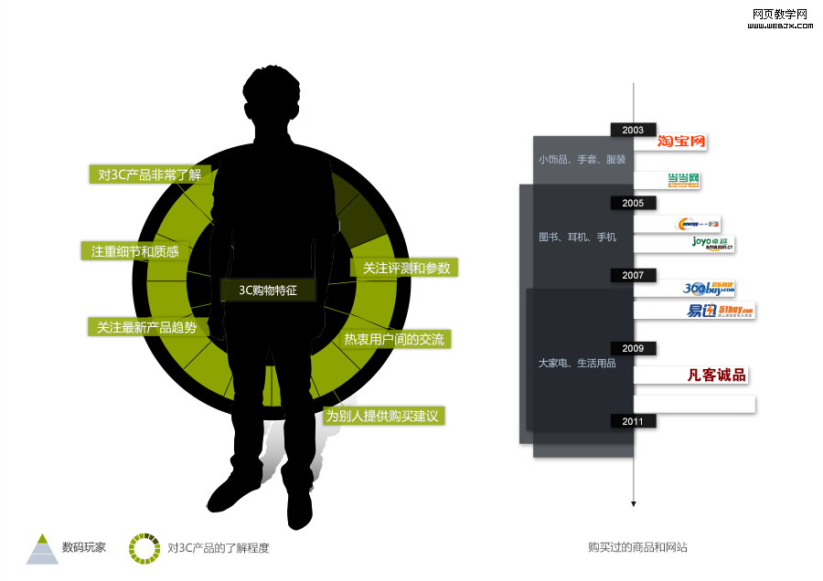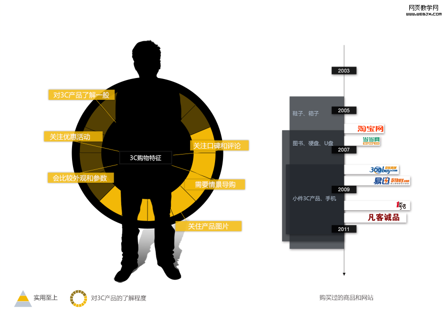 我们发现 3C网购用户的主要特征有:关注产品潮流趋势、重视商品品牌,关注商品外观和质感,关注评测和参数,注重真实用户交流,关注优惠活动等等,结合用户对3C产品的了解程度,我们建立了3位典型用户角色画像: