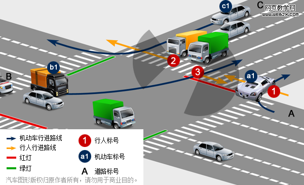 首先,对于1号行人来说,在他行进方向为绿灯的时候,他首先要躲避从A车道右转的a1,然后,前进过程中,又需躲避从B车道左转的b1。如果A,B两车道均有大量机动车排队转弯,理论上讲1号行人在不闯红灯、不与机动车抢行的前提下,永远都无法成功走到路的对面。