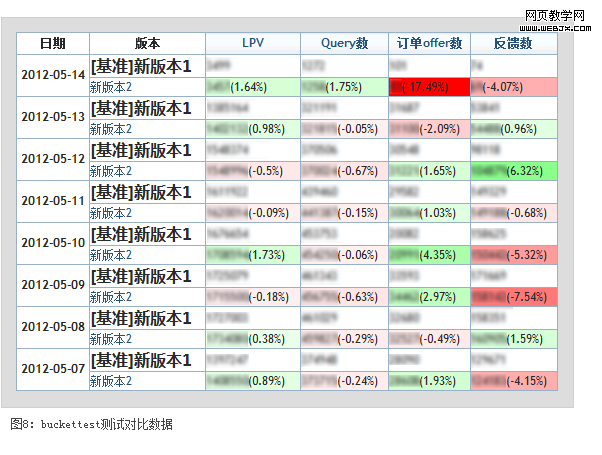 通过bucktest可以得到如图8的对比数据,红色为数据下滑,绿色为数据上涨。