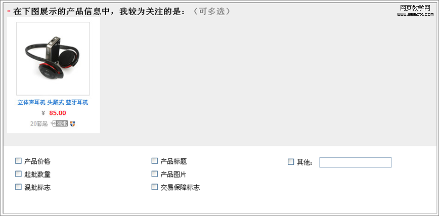 题型可以有多选题、单选题、评分题。根据调研内容确定题型。如想知道用户比较关注的信息版块,而现有的信息版块个数较多,超过了5个(数据参考:渡劫 调研问卷中多选题的分析方法探讨(2)),就用多选题,如图1;如果小于5个,比如现有旺铺的产品版块分类基于4种常见方式,则可采用评分题,如图2。评分题与多选题的区别在于评分题让用户评价更为细腻,但填答成本较高,所以适用于选项较少(一般不超过5个)的题目。如果调研内容需要明确最为关注、最常使用等性质的信息,则应采用单选题迫选,以明确问题。
