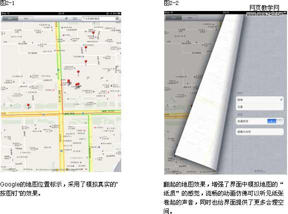 Google地图的让工具化与拟物化结合,不论是翻起页面的效果,还是图钉的效果,都是还原真实场景中的操作,通过动画的表现,让其更加逼真。也使界面更加的有层次。
