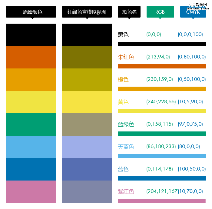 针对色盲人士的颜色识别能力,需要精心选择配色,才能避免选择容易混淆的色区。然而,要使配色能覆盖到各种色觉辨认能力的人(包括色盲、色弱和色觉正常的人群)并不是一件容易的事,尤其同一界面需要出现多种颜色时,让设计师非常头疼。日本有研究得出一组无障碍配色建议,在此分享,供大家参考。这组颜色针对色盲和非色盲人士都是易辨识的(例如它选择了朱红色代替红色,蓝绿色代替绿色,紫红色代替紫色,以减少色盲人士的困扰),它对屏显和印刷都适用,并且所有颜色的名称也容易定义。