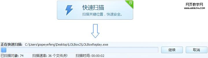 在使用软件的经历中,用户已经非常熟悉点击【扫描】按钮,出现进度条指示,然后等待扫描的结束这一整个过程。所以如下图所示,用户点击【快速扫描】,接着出现等待进度条,这样的操作概念是符合用户记忆,容易理解的,用户不会产生疑惑。