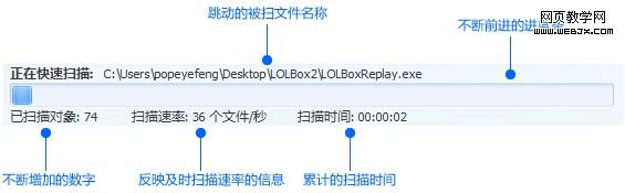 进度条设计上也同样在开始与结尾处做了优化。在扫描刚开始,我们对进度条做了假移动的处理,进度条一开始会比较快的移动起来,其实移动的这段距离与实际的扫描比率是没有关系的。比如,有100个文件需要扫描,进度条每移动1%的距离代表扫描了一个文件。假移动就是让进度条一开始快速的移动10%的距离,其实在后台并没有扫描10个文件,可能只是扫描了1个文件。这样的做法会给用户一个积极的起步感,用户看到已经开始扫描了可能就会去做其他事情。