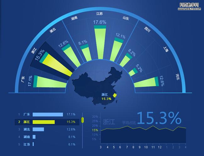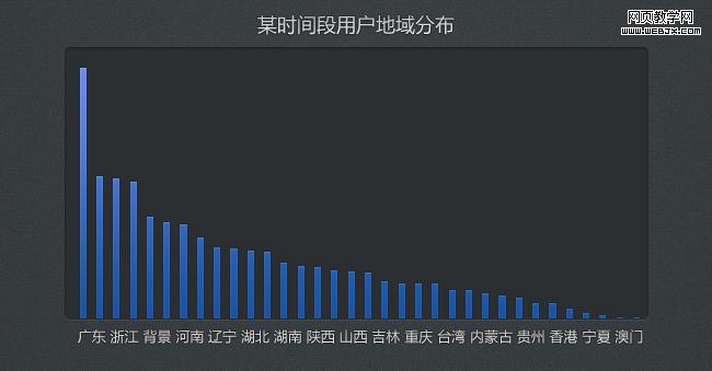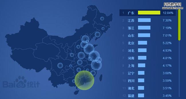 合理的展示策略:例如在对网民地域分布报告的数据进行分析后,我们发现除广东省外,其他省的数据基本呈线性排列的一个趋势,并且网民地域分布数据波动较小。在各省数据差异较小情况下,我们放弃了普遍被采用的固定数据对应固定图形的策略,而是采用了指定数据最大值与最小值对应的图形范围,期间数据按照比例展示图形的方式。通过这种方式,各省之间的数据差异一目了然。除此之外,在设计的过程中,我们导入了真实的数据作为依据,藉此保证视觉效果的和谐统一。