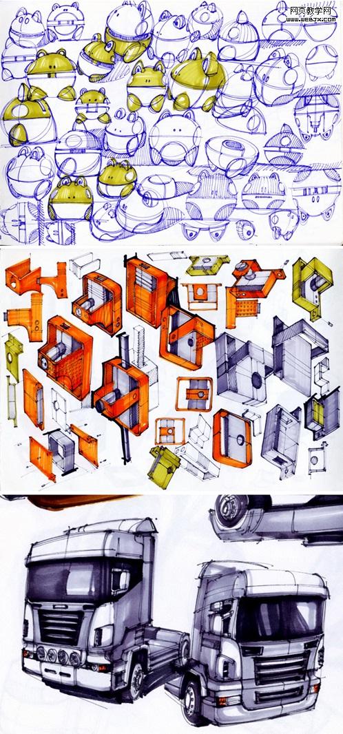 我目前已经画完了四本,现在正在画第五本,一开始画的时候,主要是自己的想法,后来慢慢的变成了收集别人好的想法和造型,到后来又慢慢的侧重于自己的设计想法的再现,这其中手绘的风格和手法也有所变化,一开始的时候画的比较随意,后来慢慢的画的比较死板,再到后来放得比较开。