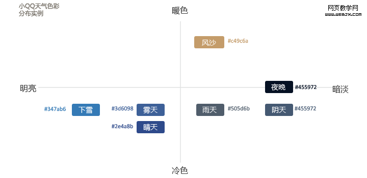 【图4】色彩上,整个小Q天气使用的颜色会偏冷色调。除沙尘暴天气以外,基本上都在蓝灰色调上,原因在于取景主要以天空为主,以自然景色为主。虽然都是在蓝色调上徘徊,但也少范围地在冷色调的基础上增加了一些暖色作为点缀,如在蓝色的阴天里加入暖黄的光,以减弱冷色系给人带来的冰冷感。