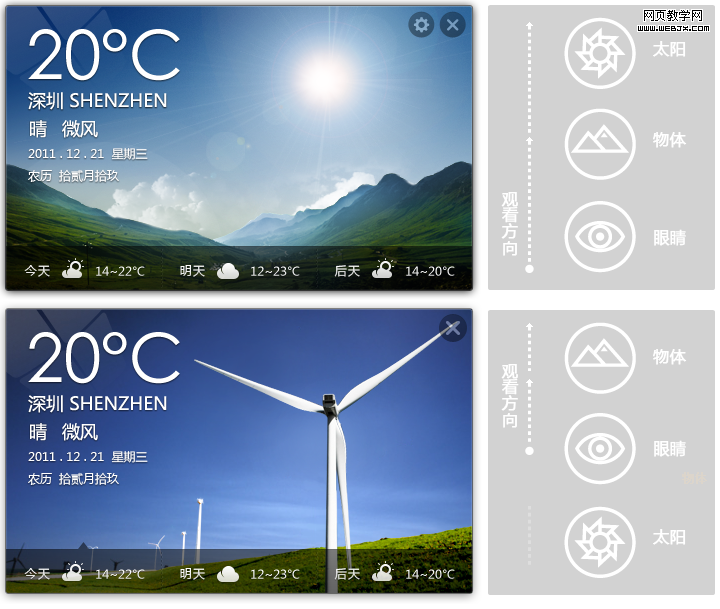 【图6】上半图为晴天的向光的天气展示,下半图为背光的天气。虽然有太阳的图片更加直观地感受到天晴的氛围。但是由于一般情况,人眼被太阳直射都会感觉到不适。而背向阳光观察事物的时候却是清晰、舒适,因此下半图的设计我们强调的是给人愉悦的感觉,在一轮反复验证之后,下图的方案被采用,并且也很快在用户的反馈中得到了肯定的声音。