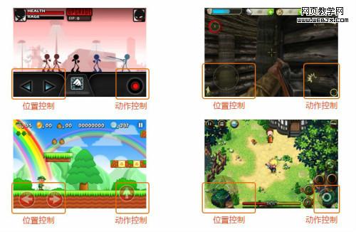 iPhone动作游戏、街机游戏和角色扮演游戏中,一般采用横屏模式,左下角为位置控制操作区域,右下角为动作控制操作区域。简单的用户使用情景:双手托住手机,左手拇指负责操作游戏中角色的位置,右手拇指负责操作角色具体的动作。