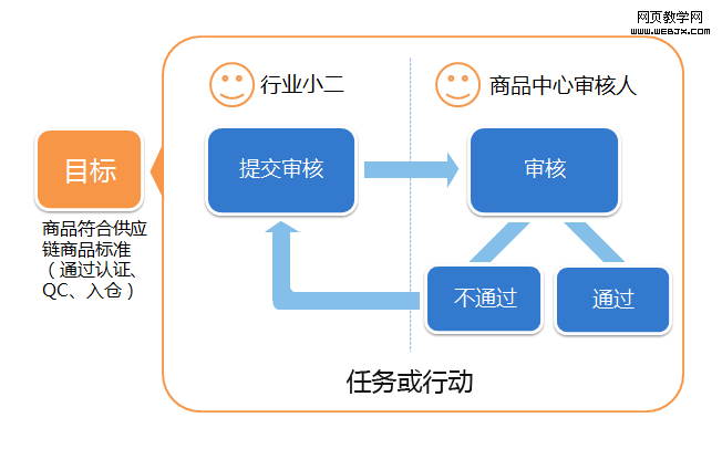 例:商品中心审核的目标是这个商品必须是供应链商品方可上架售卖(供应链商品必须通过商品认证、QC、入仓以符合供应链标准为用户带来更优的购买体验。)通过与商品中心审核人的交谈了解到目前线下由行业小二提交审核,商品中心审核人负责审核,会有审核通过或者不通过的结果反馈给行业小二。这个工作流是为了目标所做的具体工作任务。围绕目标突然发现,其实符合供应链标准的商品可以不再经过行业小二的提交操作,系统会自动将其流转到商品中心审核人那里,节省了行业小二的操作成本。