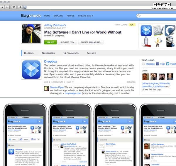 例如,桌面版的Bagcheck在一个URL上面显示所有的内容列表,评论,更新和偏好。我们将这些部分或者模块捆绑在一个单一文件中,然后在无须刷新页面的情况下动态加载每个模块。这样做可以在桌面体验上产生一个平滑过渡,但在移动体验方面就会增加许多带宽负担。
