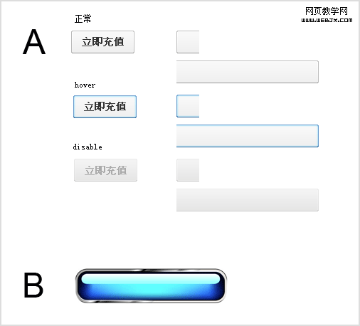 产品类的按钮我们一般都是像A这样设计(中间段是横向的重复图案),而不是像B这样,因为产品类的按钮一般都是复用的,可以用两段拼出来一个按钮,而B这个宽度就限死了。