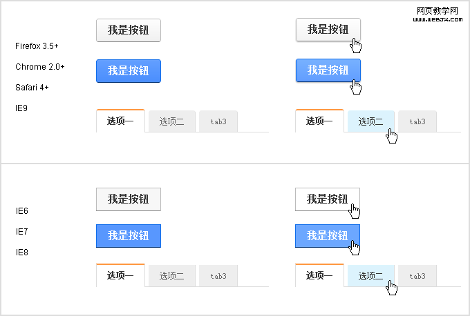 在css3中终于实现了渐变、圆角和投影,不过可惜的是IE6、7、8均不支持,但是已经可以在越来越多的网站中看到新css的应用,尤其是按钮,淡淡的渐变,hover上去有点淡淡的阴影,效果很好,对于不支持的浏览器,设置一个颜色近似的背景,看到的是单色、直角效果。