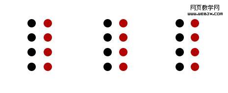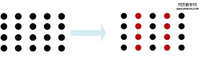 我们对比下面这两幅图,左边那幅图是的黑点,会让我们觉得他们是一块整体。这时候,如果我们将其中的一些黑点换成红色的点点(右边那幅图),根据我们在潜意识分类,会自动将黑色的点集合在一起,红色点集合在一起,各自成为一个分组。如此一来原本单一的整体就被切开成为五个组了。(如下)