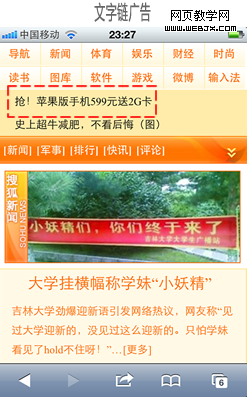 基于易用性设计:Wap站内容需要快速展现给用户的时候,设计广告可采取文字链的形式,因文字链访问速度最快,对Wap站的打开速度影响最小。
