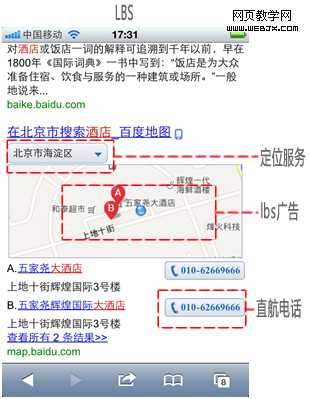 移动搜索广告:根据用户输入的query和用户所处地理位置,高度精准的推送相关广告内容给用户,并可实现广告的拨打,快速实现O2O(on line to off line)模式 ,拉近用户和广告主的距离。