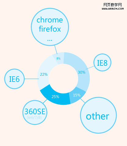 图标中可以看出,IE6占比逐渐降低,而支持css3的浏览器,也占有了相当的份额,也就意味着,我们一方面可以更多有选择的放弃IE6的兼容,另外,也可以在支持CSS3的高版本浏览器上做更多的考虑。