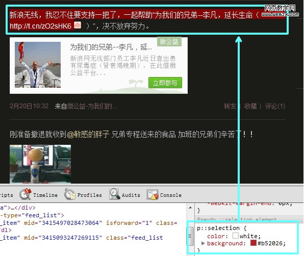 但是微博主站有不同的皮肤,深深浅浅。当遇到一个暗色皮肤背景,依然显示蓝底儿白字,那效果就不是特别帅气了。这时候,其实可以考虑用伪类selection为网页文字的高亮提供了设计方案,来改变反选展示效果。鼠标选中文字后可设置相应的背景色和文字色,甚至是透明。简单一个属性就体现了产品对用户操作的关怀,从而提升用户使用感受。