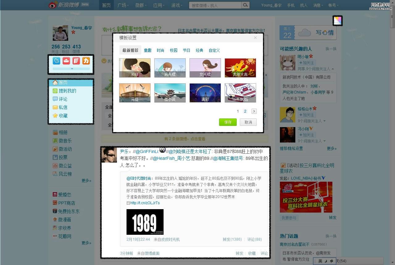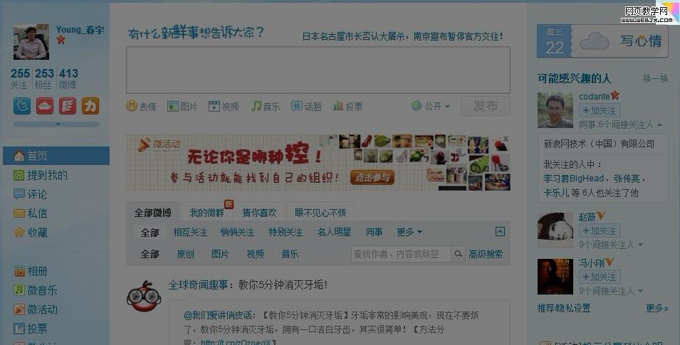 在摄影作品中,讲究布局不要太死,要给照片“留口气”。借鉴到网页设计中,这个说法同样有它的存在意义。先看看我们的微博首页,各个模块之间挤在一起,看上去布局有点闷,这时候,右上角那个彩虹按钮就成了点睛之笔。