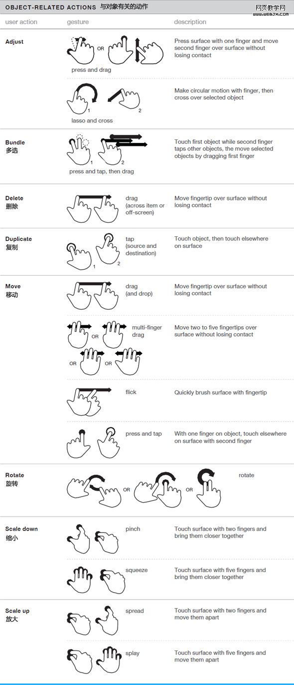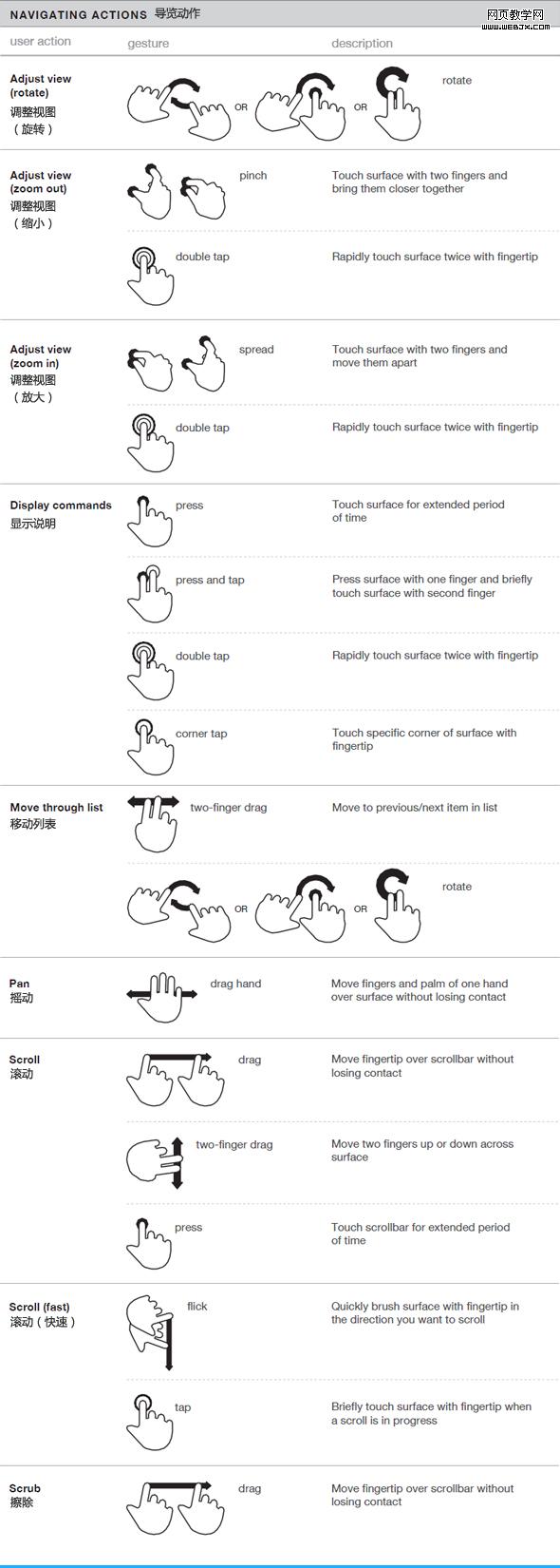 以上都是触屏设备中常用的手势操作,是我看到过最全的总结。
