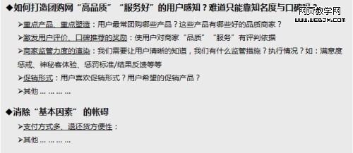 3、比较对象的差异(如:直接问团购考虑因素,用户潜意识会参照普通网购,实际购买考虑因素往往又变成各团购网之间比较)