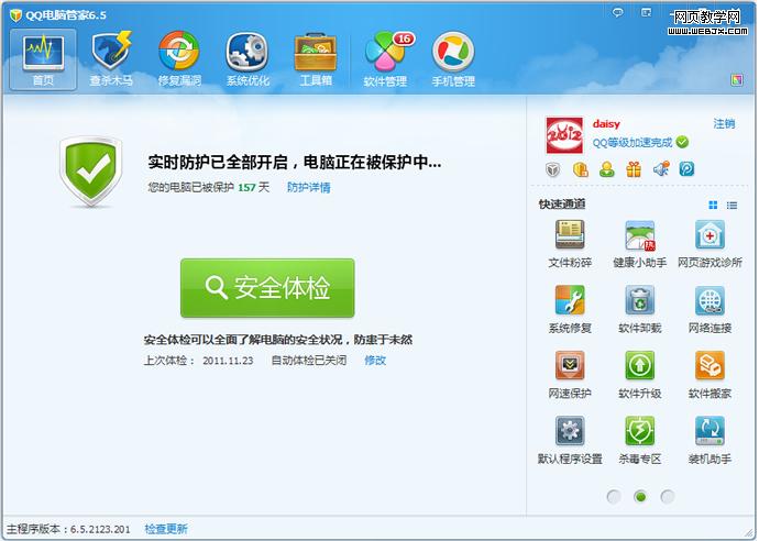 用产品本身来实现引导就要求产品需要做减法,保持产品简洁,突出核心功能,让用户一目了然。QQ6.3电脑管家通过简化布局,通过大量的留白和跳出的绿色大按钮聚焦用户视线的焦点,清晰告诉用户这个界面是用来安全体检的。