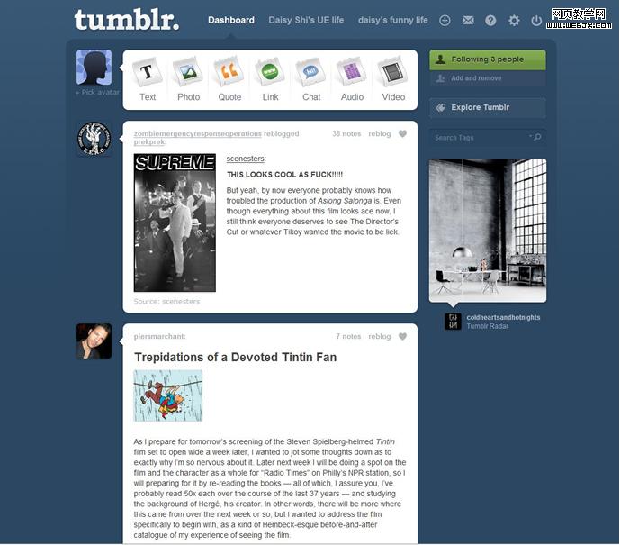 人的视线会先看到亮色调(暖色调)的部分,后看到暗色调(冷色调)的部分,所以也可以用亮色调(暖色调)来突出核心内容,让用户的视觉聚焦在那里。轻博客鼻祖tumblr用暗色调弱化背景、导航,亮色调突出内容部分,让用户的视线焦点集中在发轻博文和阅读他人的博文的沉浸式阅读体验当中。
