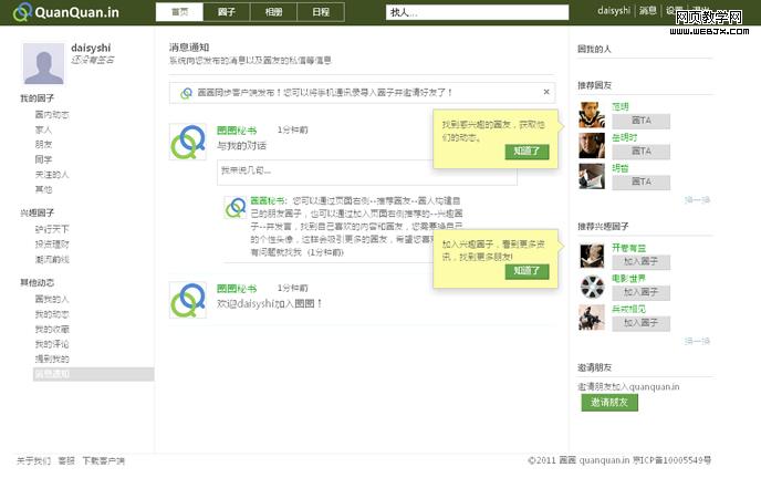 QQ空间用形象的tips告诉用户新增的回收站的功能;朋友网用tips推荐用户找朋友实时聊天。