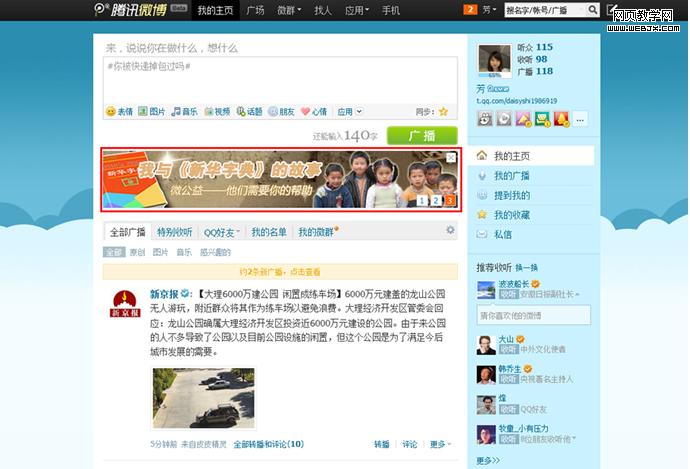 腾讯微博用在微博正文上方小banner来每天推荐不同的活动让用户能够参与进来,提高他们在微博中的活跃度。但同时也要注意到用户容易把banner当成广告无视掉的习惯,可以更加精心地设计小banner,让它看上去不像广告。
