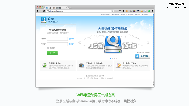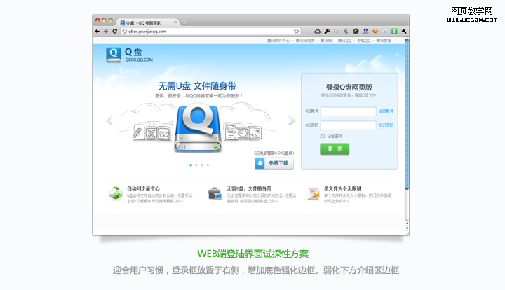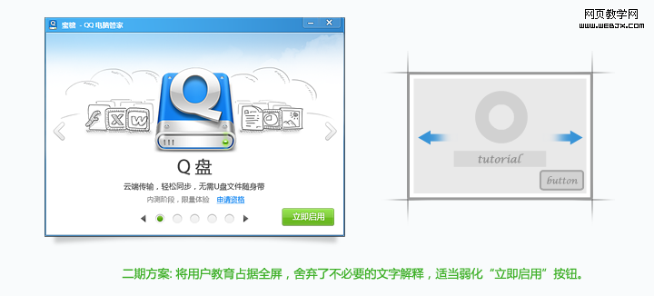 传统软件安装的用户教育通常放置在安装完成之后,用户可以选择看与不看。但Q盘无需安装,只是登录即可使用。为了在用户首次启用时引导用户了解Q盘,吸引用户使用,Q盘中的用户教育采用了提前处理。