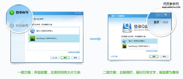 一期方案中,为了凸显首次启用Q盘的便捷性,将步骤引导做了最大化处理。但随着对产品的反复思考,设计师认为这样的方式存在“空白过多”、“界面不精致”等问题。对此,Q盘首次启用界面做出了“放血”的改变。从一期(左图)到二期(右图),界面尺寸从600*420改为520*380,弱化步骤引导,轻量界面效果。