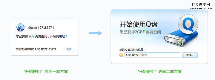 一期考虑开发成本,产品侧期望用户不要随意更改文件夹位置。对此,在设计表现上采用了弱化“更改”的形式。但在此形式下,“开始使用”页面没有成就感,设计气氛太弱; 另外,在“已获得2GB免费空间”的处理上,单纯的文本形式也无法凸显产品优势。针对以上问题,我们进行了思考,利用最短的时间做出最质优可行的设计效果。