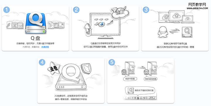 教学界面采用手绘的形式表现,简单生动地对Q盘的功能、使用方式进行介绍,手绘线稿的表现较有亲和力。