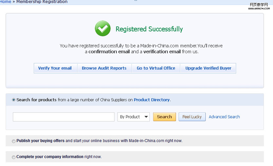 ④注册成功后,需要”夸奖“一下用户,并告诉用户下一步可以干嘛。(如果让我写文案,我要模仿数字公司的安全检测—-恭喜你!你已成功打败了19999的火星用户,注册成功了 !下面你可以去发布产品或者继续完善公司资料)
