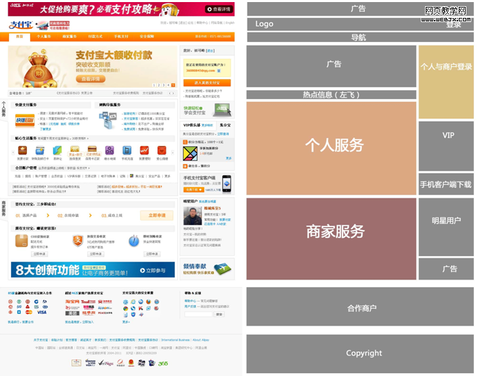 1、块面多:页面小块面太多,容易让用户眼花缭乱。用户群有个人服务和商家服务,虽然在页面上有大块的区分两者,但是对用户来说,还是有些混乱(请看下图);