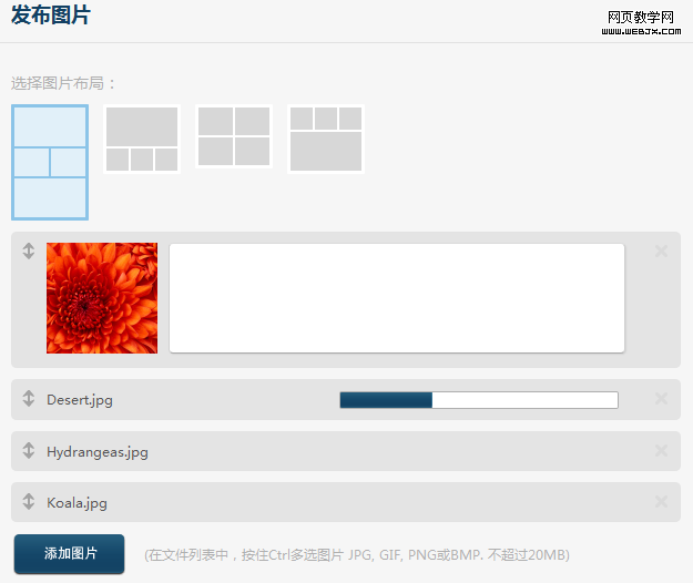 ↑ 点点网上传图片过程中有上传进度显示,已上传成功的图片可以添加描述,可以选择图片布局,可以删除图片