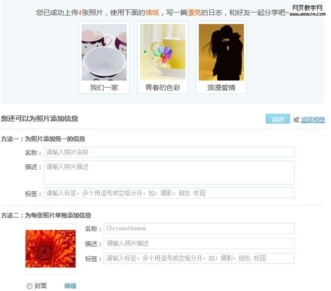 ↑ 图片上传完成后,QQ相册推荐你为图片增加描述,写图片日志