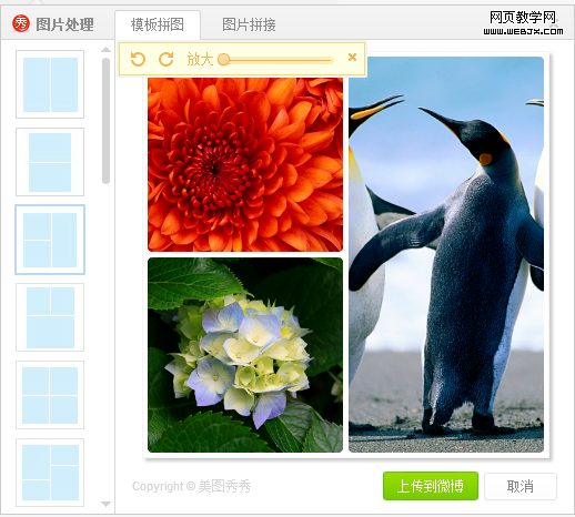 ↑ 在微博上,图片上传完成后可以拖动鼠标排序,放大、缩小图片等简单处理。