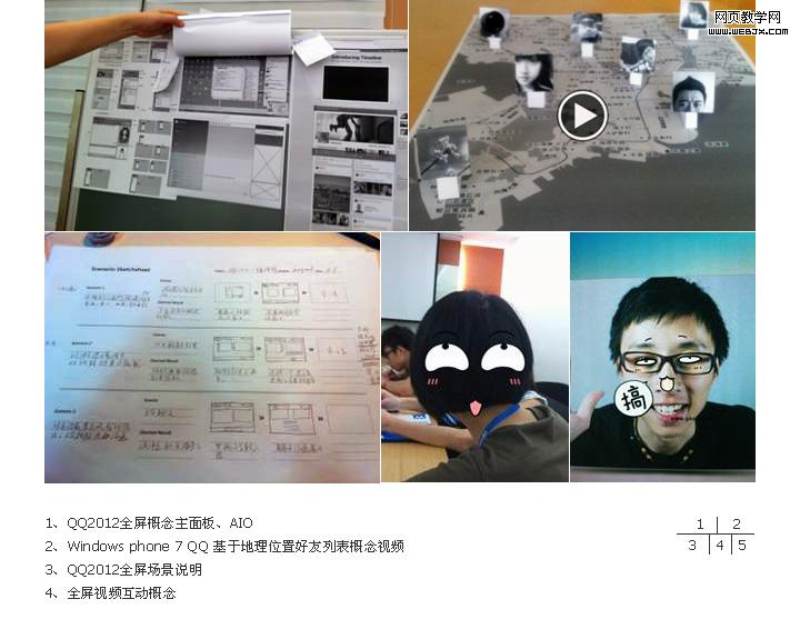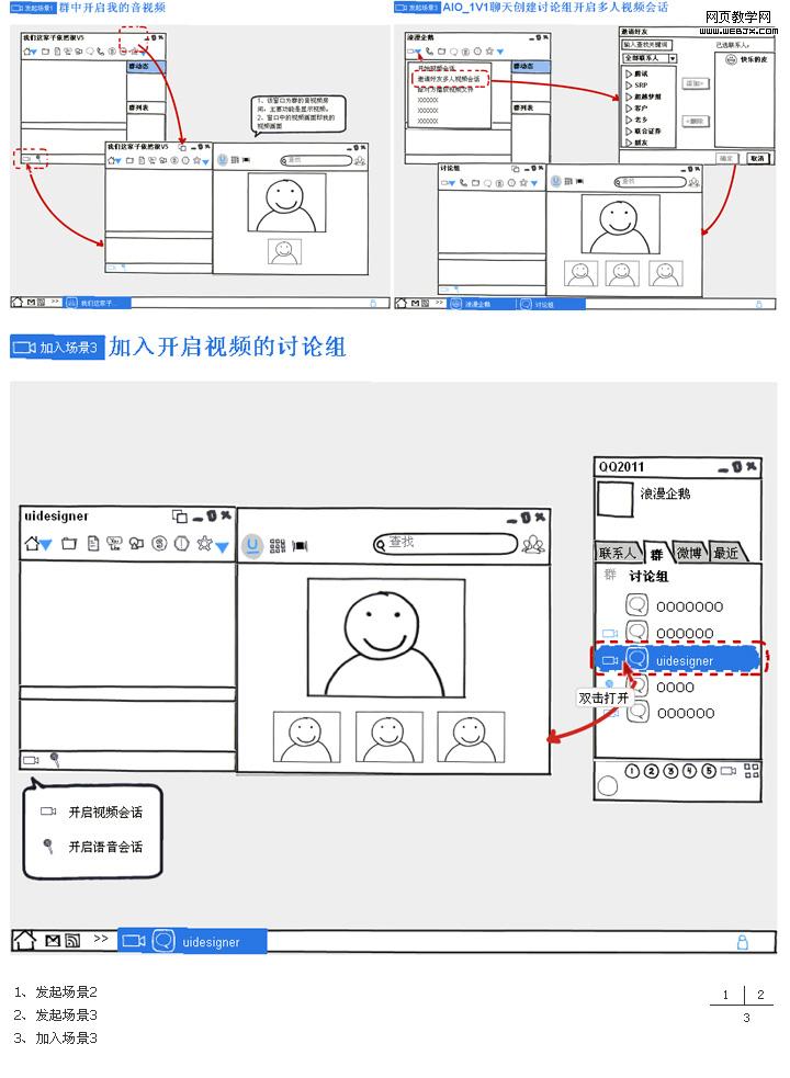 以QQ多人视频为例,在设计的初期需要做几场用户访谈。但当时的情况是没有时间做demo及高保真的原型。为了不浪费这些与用户亲密接触的机会,就绘制、打印了大量场景草图,来验证我们对各种场景下用户如何使用多人视频的预期。