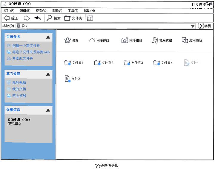 上图是QQ硬盘概念版。当时是希望表达一个与操作系统体验一致的概念。仔细观察你可以发现,这其实是一个局部修改了的XP系统文件夹。其实在出这一个稿之前,有过类似的交互稿(用XP系统文件夹截图后修改)已经提交给产品,但并未引起重视。