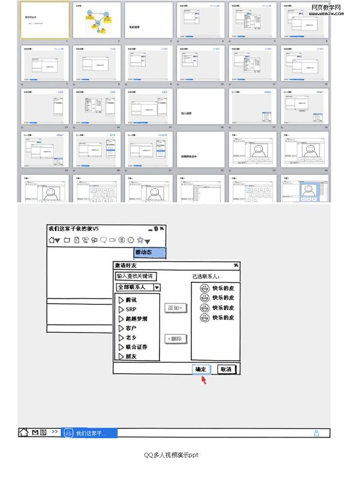 上图是QQ多人视频会话方案演示的ppt。当时由于急于给老大们汇报,但是无论产品功能模块,还是交互逻辑都是非常的复杂,传统的交互设计说明书邮件,需求文档都很难短时间把方案说清楚,所以制作了一个类似demo的ppt。一定觉得不可思议,本身用ppt做demo就是很不常规的做法,在加上草图就更难想象会是什么效果。