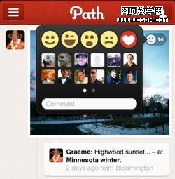 好的用户体验是离不开UI的,而且作用很大。尽管我不是一个合格的Path用户,但是当打开的时候,我还是会浏览一遍。顶端的5个笑脸图标更是很有爱。这也正是facebook没有意识到的地方。