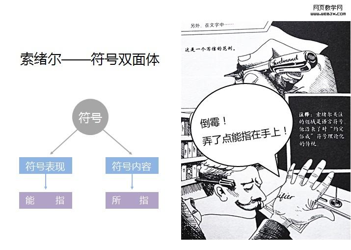 索绪尔与皮尔斯是符号学研究领域的先驱者,索绪尔的结构主义符号学为欧洲符号学研究奠定了基础概念,他将符号学分解为能指(Signifier)和所指(Signified)即指称物和被指称物两个部分,也就是形式与内容。
