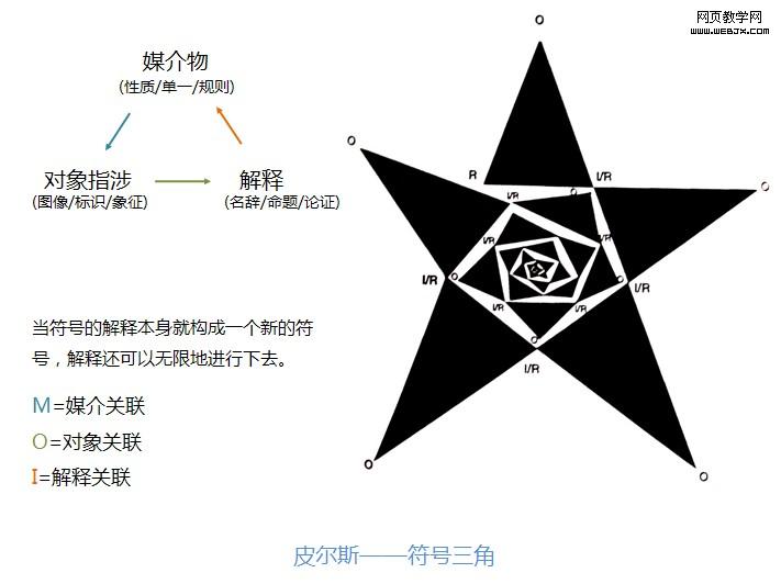 相对于索绪尔的研究方法是围绕能指和所指两个侧面展开的二元化,皮尔斯则是三元化的研究方法。他认为符号学含有符号、客观对象、解释这三项,弥补触及了索绪尔没有涉及的部分。皮尔斯是美国的实用主义哲学者,他的符号学理论建立在对意义、表征、符号概念的逻辑学研究基础之上,概括起来为三种范畴:设计感觉质,人的经验,思维三个层面。即媒介物、对象指涉、解释这三要素构成的三角形关系。他的理论具有普适性,适用于任何领域,被称为“广义符号学”。听到为数最多的要数对象关联层下的三个下位符号:图像符号(icon)、标识符号(Index)和象征符号(Symbol)。
