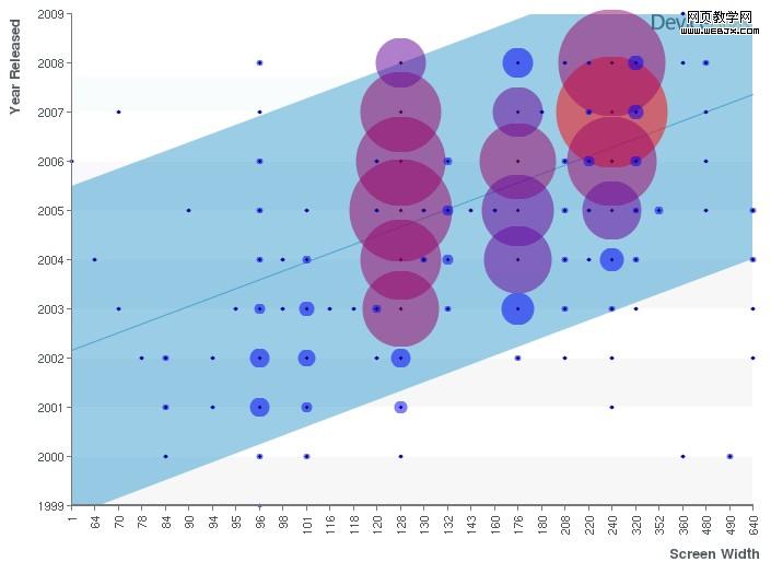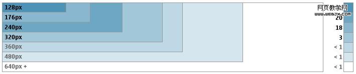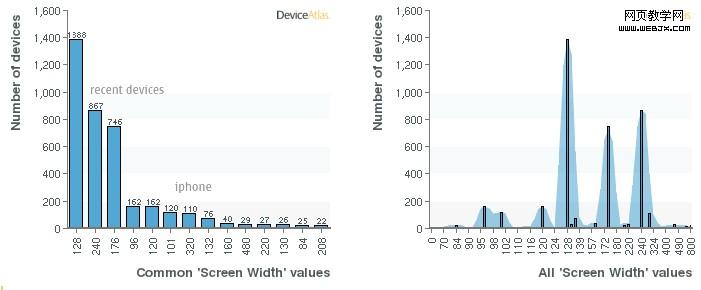 还有一点,不到5%的设备宽度大于320个像素。但这一数字可能会在未来有所提升,目前已经可以看到,小屏幕(128,176等)设备正逐渐被大屏幕(240+)设备所代替。下面的图表给出了相关的分析。