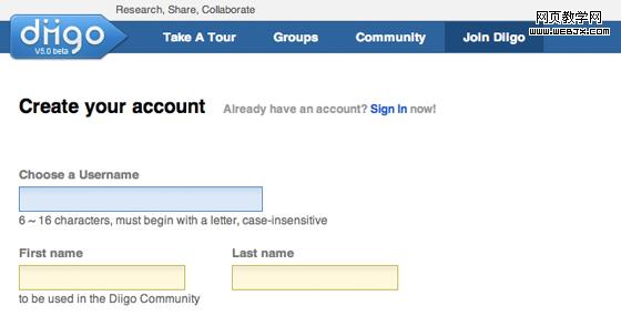 Diigo的注册表单结构就很大气!你需要缓和不同输入元素之间的冲突。加粗的文字提示你哪些区域已经填写了,哪些区域还空着,当激活某一输入框时,它会变成淡蓝色,提示你光标现在所处的位置。