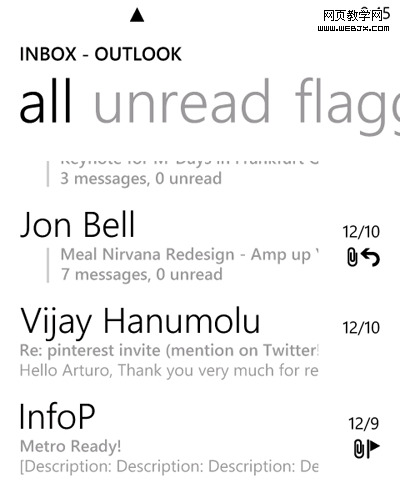 Metro设计语言由三件事情所定义:Windows Phone的native应用(邮箱应用、文字消息应用、people hub、本地搜索等等);第二,Windows Phone UX Guidelines;第三,控件库与其它Windows Phone SDK & Silverlight Toolkit的可用资源(所有的三项彼此之间会保持一致性)。开发人员与设计人员可用使用Metro设计语言。这会成功地为Windows Phone建立精巧美观、引人注目与一致性的体验。